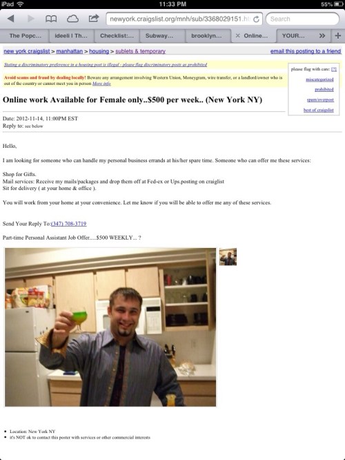Craiglist is partly a mine of pervs and scams, check this amazing ‘job offer’ I found. Revel in the nonsensical creepiness of it all. No, strangely bearded man, I would not like any of your roofied green drink. Thanks though!