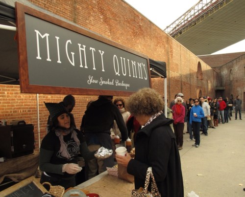 I've written before about the Brooklyn flea markets, held every weekend in Williamsburg and Fort Greene. The same collective also run two food markets every weekend, Smorgasburgs, in Williamsburg (natch) and DUMBO. A couple of weeks ago we visited the latter, for the last market of the season. We spent our time munching through the stands, some crunchy schnitzel on pretzel bread here, a little pulled pork slider there, donuts, pizzas, pesto popcorn and even some oysters for our market companions (not for me though, sorry for being so graphic but oysters make me think of salty snot. Ick).