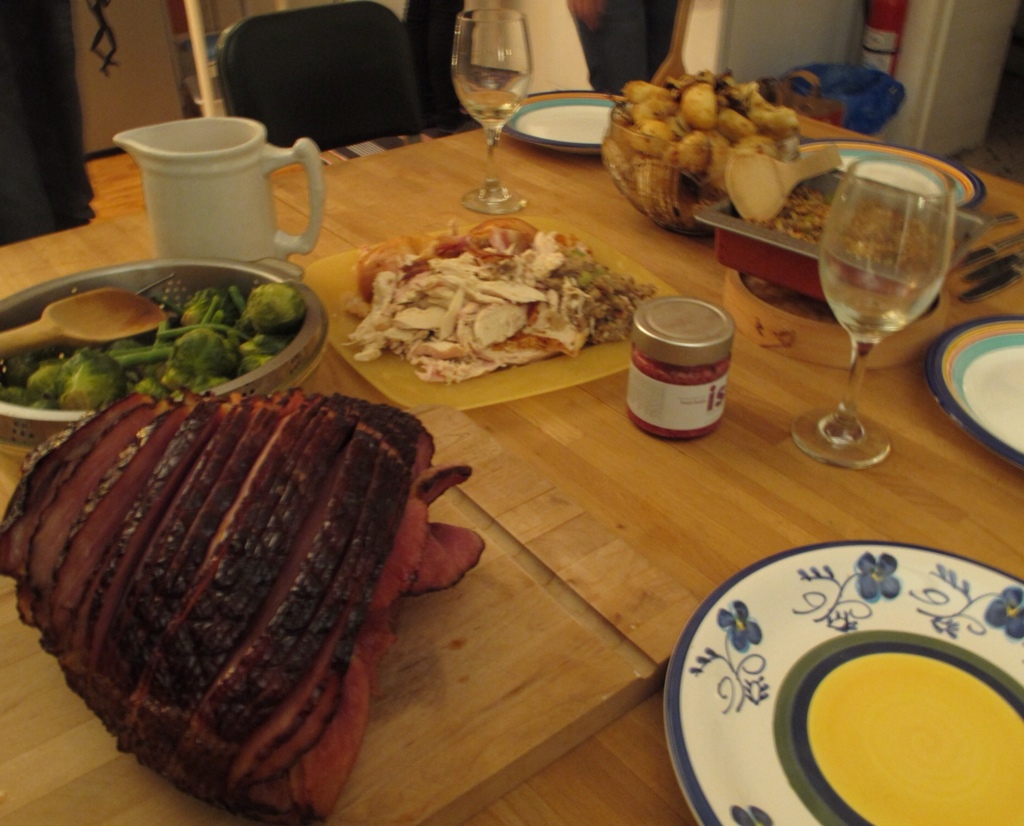 Inspired by all the food on display at the Smorsgasburg, we decided it would be rude not to revel in the tradition of the Americans by cooking a meal for Thanksgiving, when in Rome and all that jazz. A couple of Canadian friends came to join us and we dined on turkey and an enormous mega ham, which Mr procured despite my protests about its size. Mr was right though, that ham was deeeeee-licious and we got a whole ton of meals out of it. Tasty AND frugal! Apologies for the schoolboy error of not taking any pics of the turkey before carving. I'm sure you can imagine roughly what it looked like (hint – like a roast turkey).