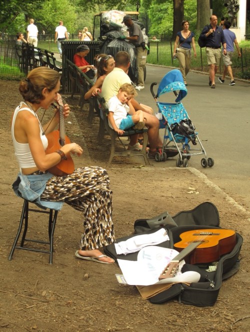 A wee stop by the Delacorte theatre (where Shakespeare in the Park occurs) happened us upon this nice lady singing pretty songs. I liked her and gave her money, Mr complained that she was a ‘wailing hippy’. I think the little boy agrees.