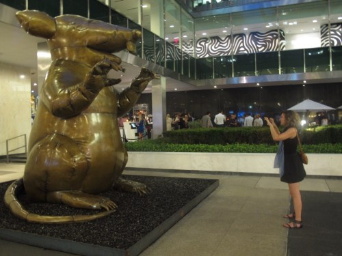 What with NYC being one of the biggest, most densely populated cities in the world, there’s a *bit* of a pest problem here. I’ve seen a couple of cockroaches scuttling across my path, which made me squee and squee. The larger problem though, is rats, which are enormous and numerous. I stumbled across a show on tv called Rat Bastards t’other day, which documented strange Southern men in the Bayou who get paid $10-15 for each rat they shoot. The rats were insanely huge, like beavers in size and tooth, but without the cute flappy tails and building capabilities. I’m told NYC rats compete with these Southern swamp bad boys. I doubt the statue below is life sized but I thought I should take a stand for humanity by bearing my teeth at it anyway.