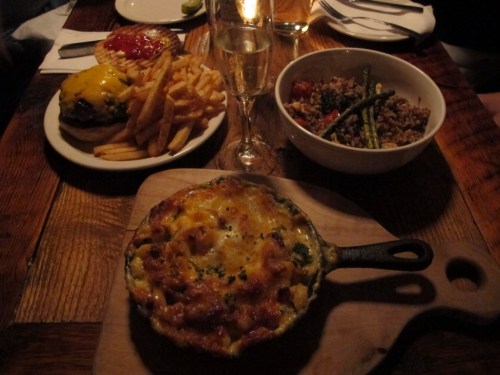 Enormous burgers, Macoroni cheese with bacon and smoked cheese and a sneaky salad for our more health conscious bud.